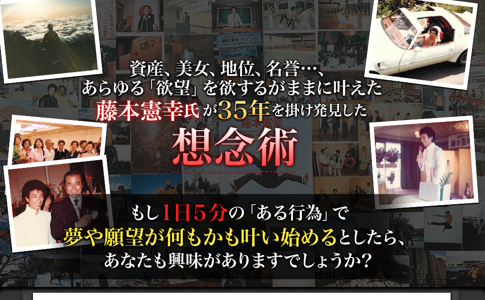 実は、当初は藤本憲幸氏はこの「想念術」を教えることに難色を示していました…、なぜなら、善悪関係なく、全 ての願望を実現してしまうからです!あなたが正しいことに利用すると誓えないなら、今すぐページを閉じて下さい
